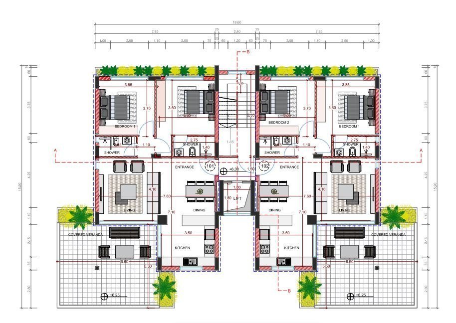 The modern design building includes two 2-bedroom apartments on each of the first two floors and two 3-bedroom, split-level apartments on the 3rd and 4th floors with private roof gardens.